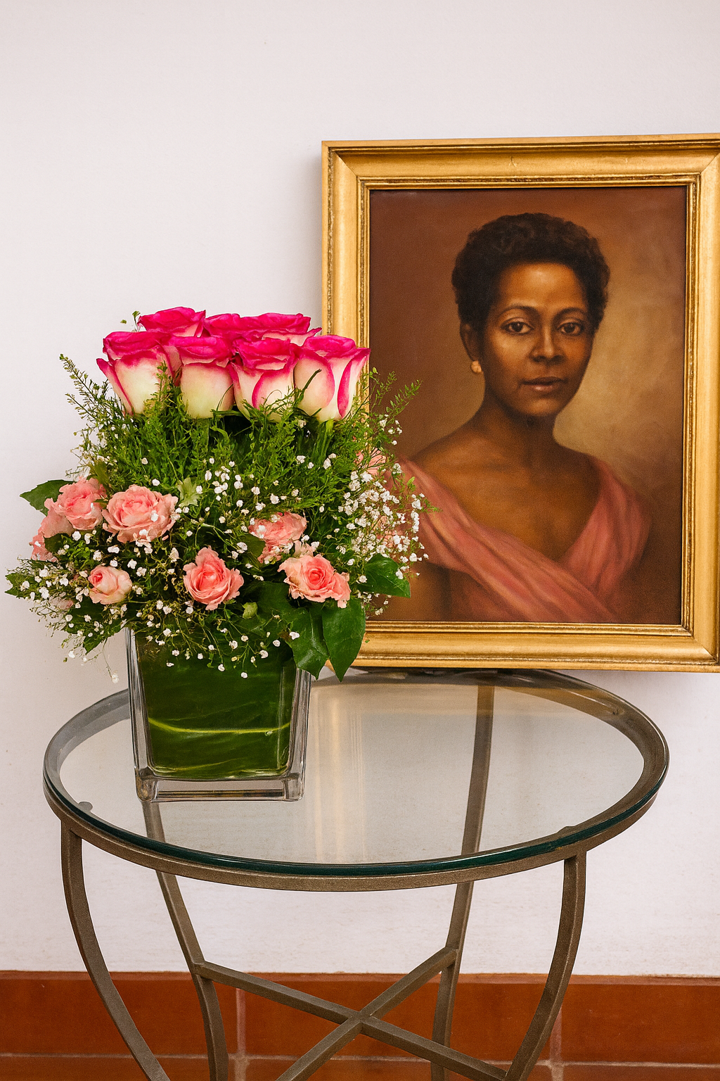 Vase of roses and gypsophile