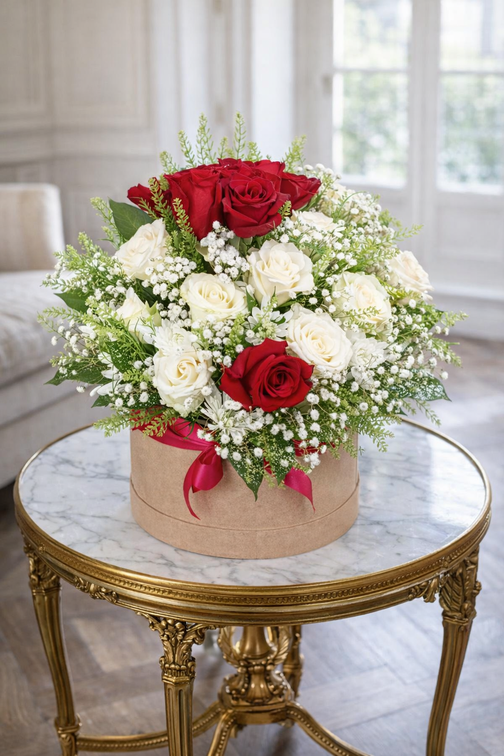 Box of white and red roses